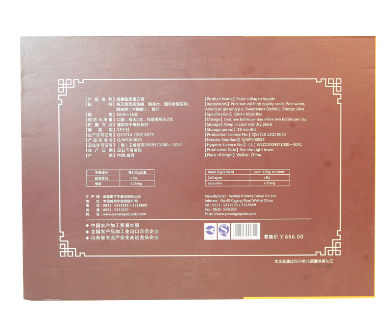 配 料:純天然優(yōu)質(zhì)魚鱗、純凈水、西洋參提取物、甜味劑(木糖醇)、橙汁